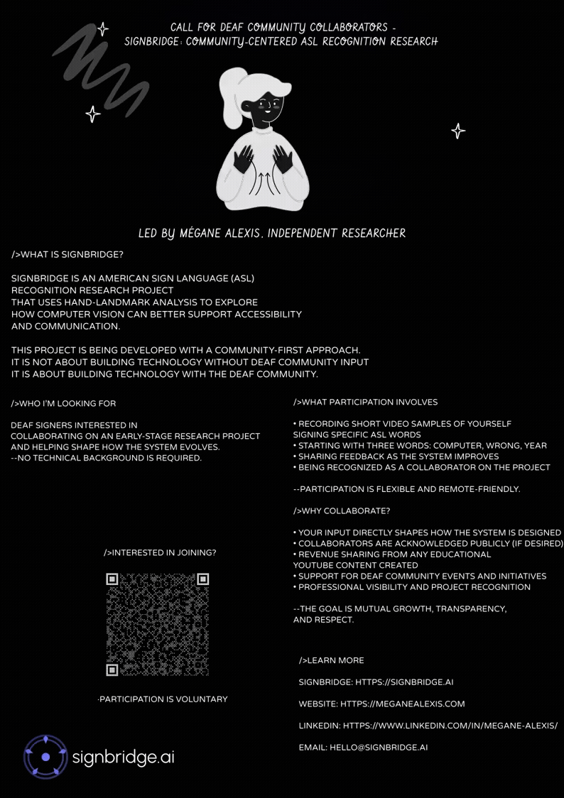The most important part is that I'm building SignBridge with and for the Deaf community. That includes revenue sharing and community ownership from day one. That is the only way I'm willing to build it. I am currently exploring PhD programs for Fall 2027 that align with my interests in ethical AI, post-quantum security, and accessibility technology.